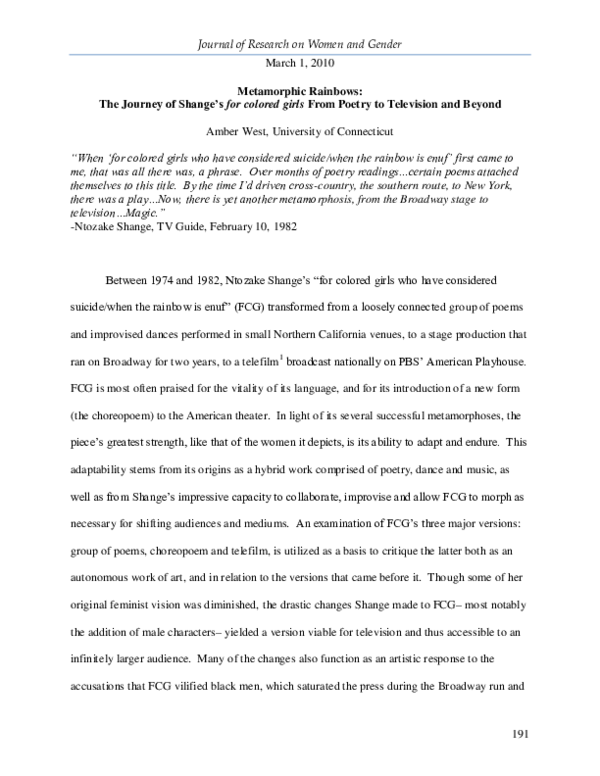 Pdf Metamorphic Rainbows The Journey Of Shange S For Colored Girls From Poetry To Television And Beyond Journal Of Research On Women And Gender Jrwg Academia Edu
